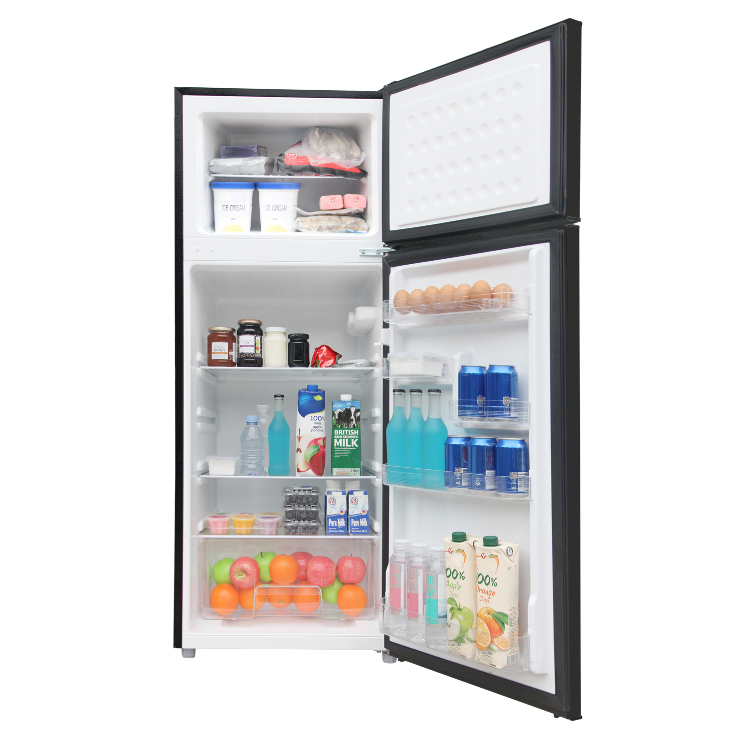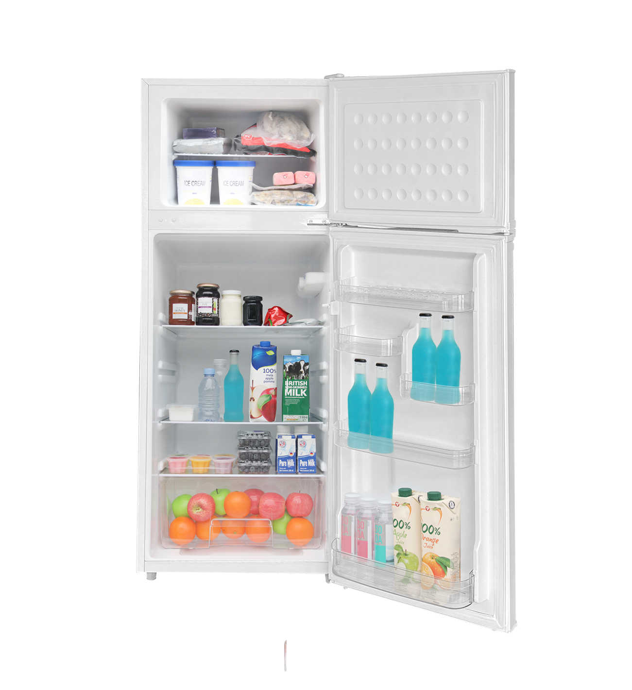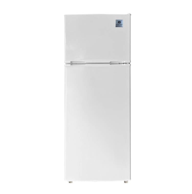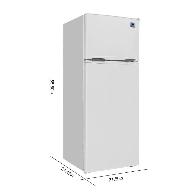 CONVENIENT 2-DOOR DESIGN: SEPARATE FRIDGE AND FREEZER COMPARTMENTS FOR EASY ORGANIZATION.